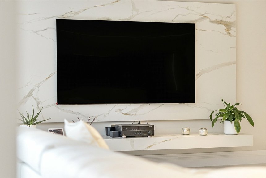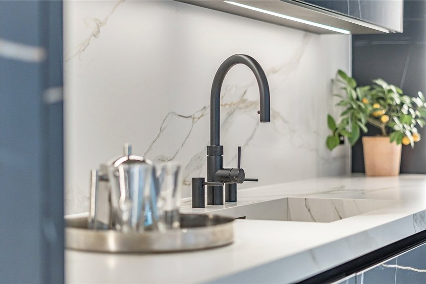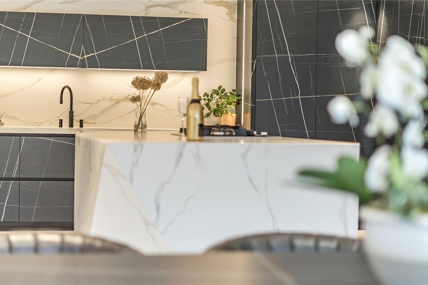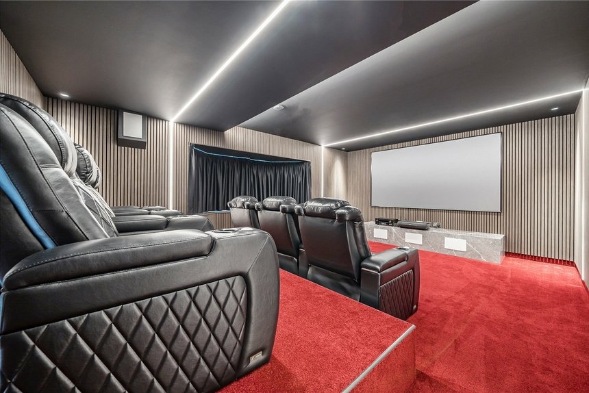 To the front of the house, a sophisticated cinema room offers a true home theatre experience, fitted with SCHHH acoustic wall panels and integrated LED lighting. A separate reception room adds further living space, featuring a dramatic dark porcelain large format tile wall with gold veining, bespoke shelving, and a recessed gas fireplace, creating a refined space for relaxing or entertaining. A dedicated study with custom-built desks provides the ideal environment for home working, while a fully equipped utility room, fitted with premium Samsung and Siemens appliances, ensures day-to-day functionality is met with style. A guest cloakroom adds to the practicality of the layout, while the entire ground level is unified by sleek Rak Carrara large format floor tiles, offering a seamless and sophisticated finish.