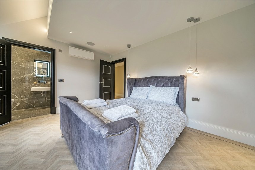 The sense of luxury continues in the principal bedroom suite, which boasts a spacious Lusso round stone bath. The second bedroom offers its own ensuite with a jacuzzi bath and private dressing area, while the remaining two double bedrooms each enjoy their own ensuite shower rooms and integrated wardrobes with exquisite Italian fretted doors. Throughout the sleeping quarters, Amtico flooring adds warmth, texture and durability.
