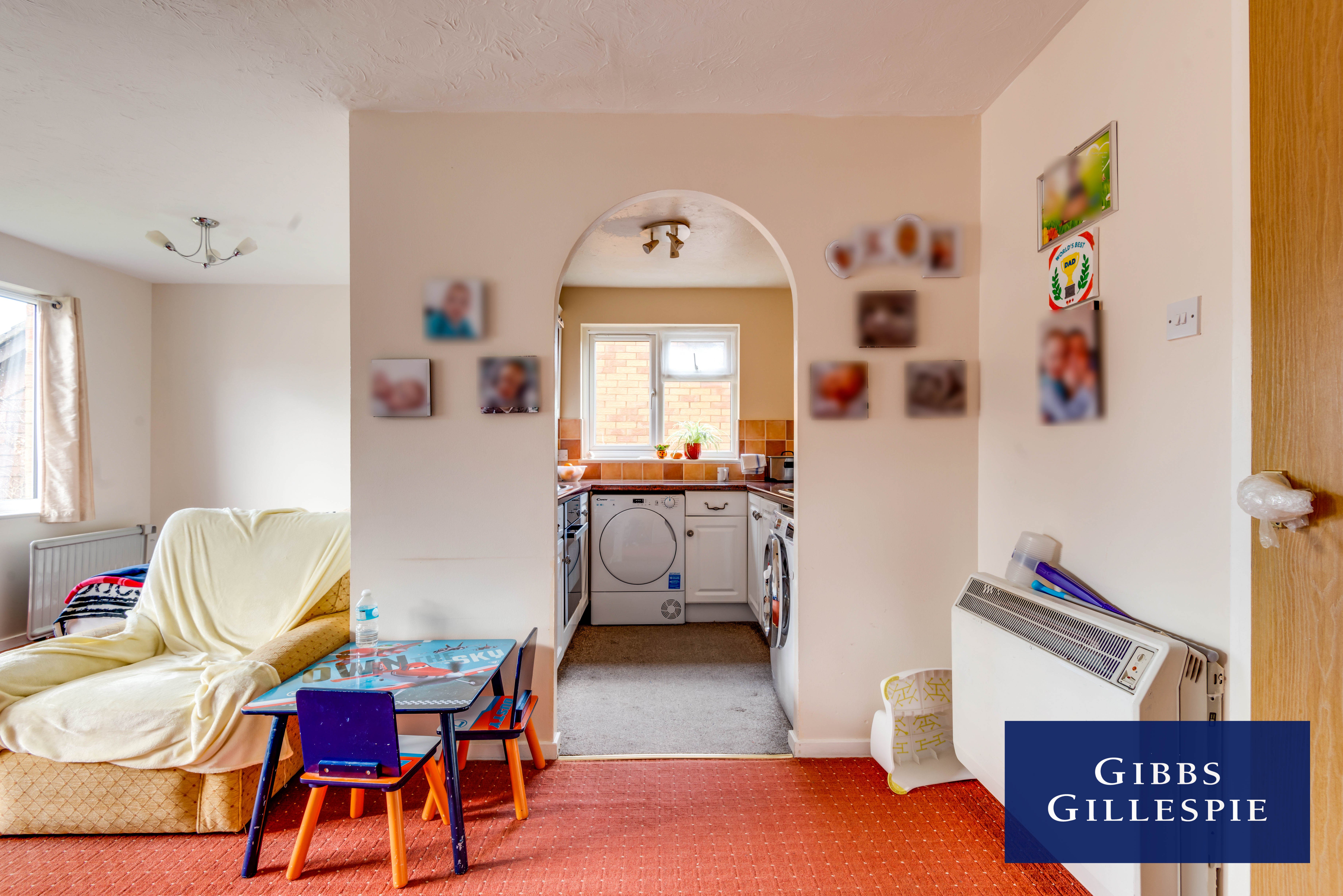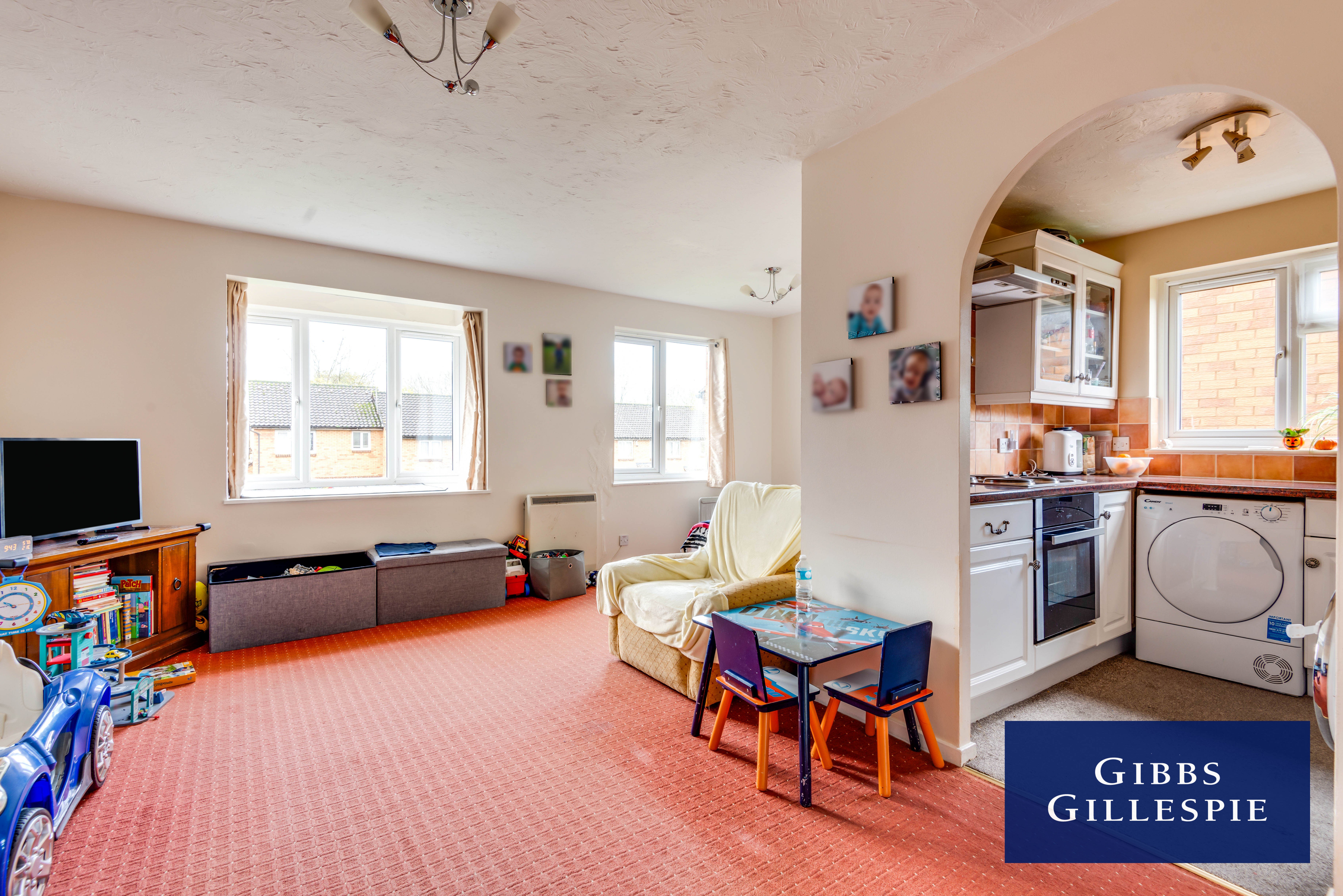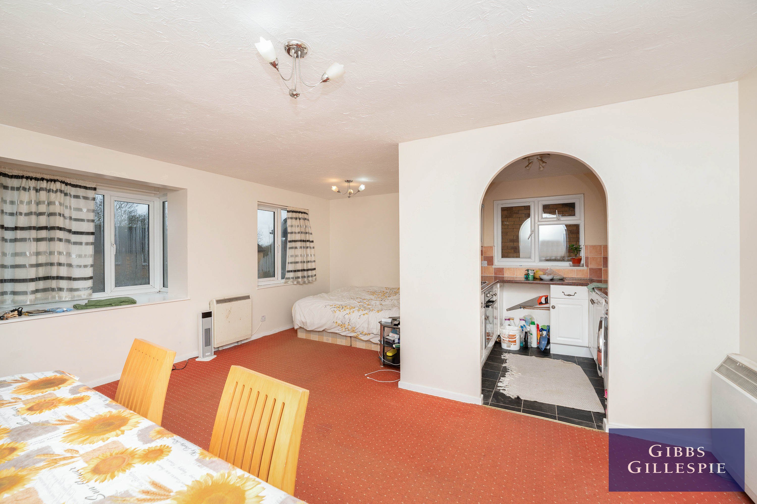 Accommodation comprises of entrance hallway with storage cupboards, door to living room, bathroom featuring bath with shower above, archway leading to kitchen with appliances, one double bedroom and one single bedroom. The property also benefits from communal parking and electric heating.